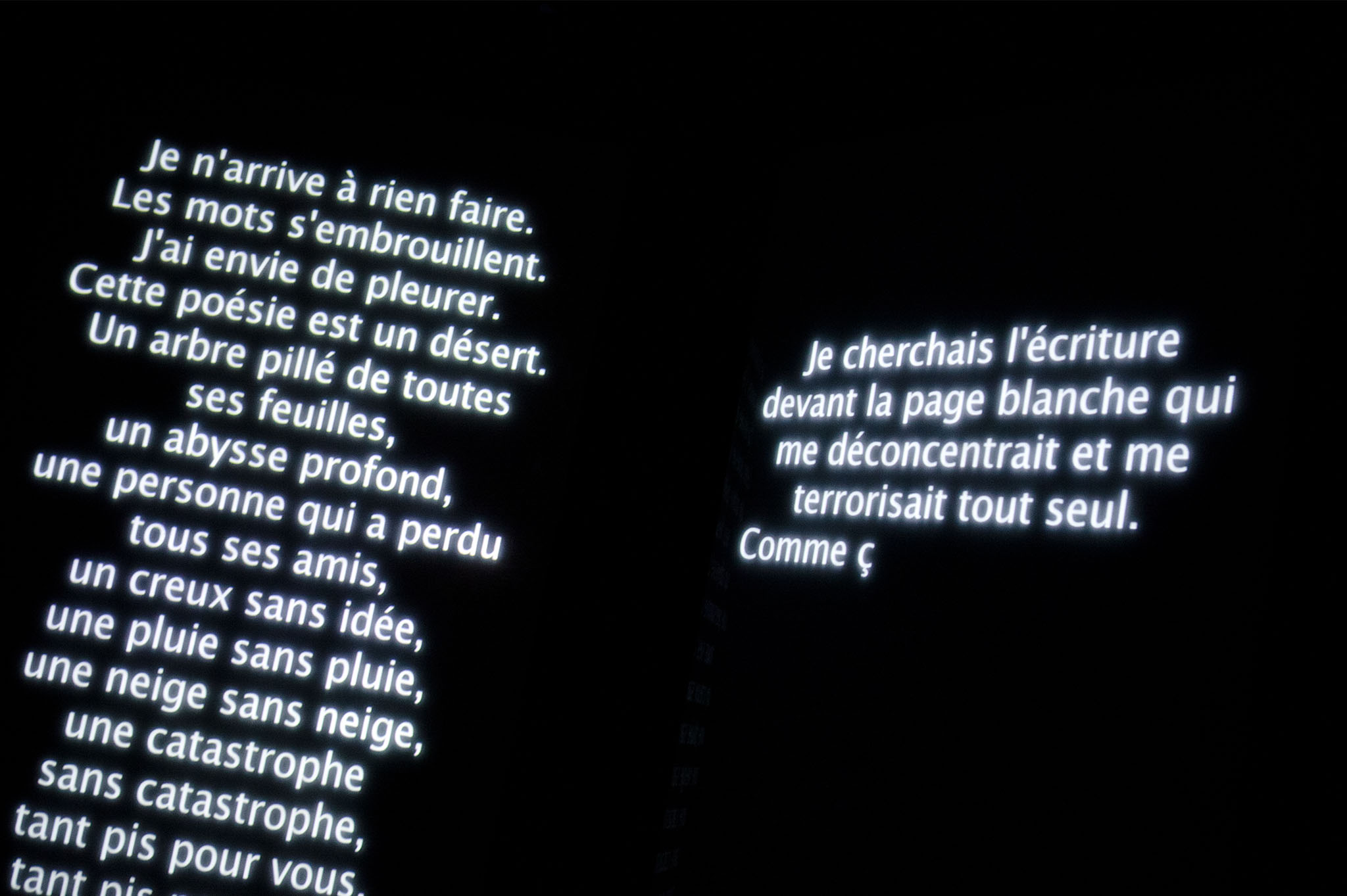 J’ai volé vers la porte des mots et les mots m’ont rejeté. Parce que j’ai désordonné les mots, le monde m’a rejeté. J’ai racheté les mots, je ne sais pas ce qui m’a pris…