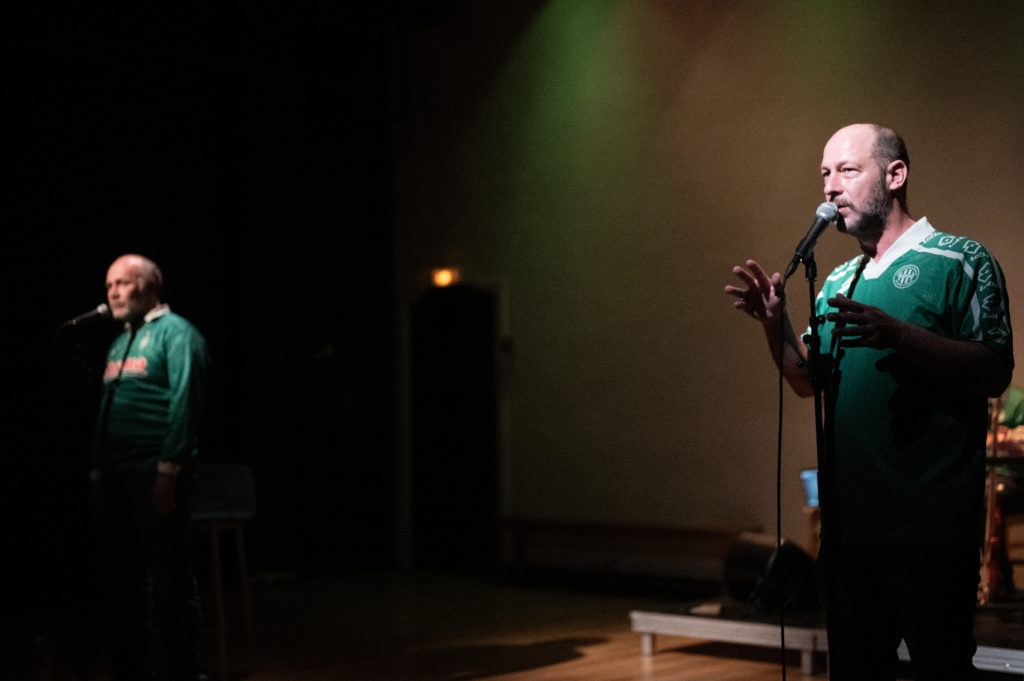 BESTIAUX! : récit concert de l’histoire de deux footballeurs, passés de concurrents à amis… Récit polyphonique d’un match épique, vécu par l’un cloué à l’hôpital après une opération du genou, et par l’autre sur la pelouse pour la première fois de la saison, 30 000 regards sur lui au même instant. Récit aussi de deux reconversions, de l’après-carrière ; ou comment ne pas gagner